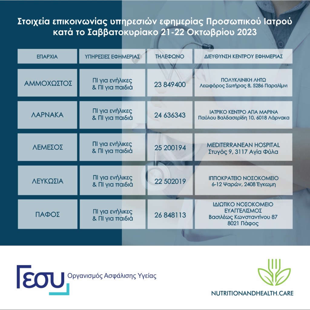 Σημειώνεται ότι, τα πιο πάνω στοιχεία επικοινωνίας των Υπηρεσιών Εφημερίας ΠΙ θα προσαρμόζονται ανά τακτά χρονικά διαστήματα και θα αναρτώνται στην ιστοσελίδα του ΓεΣΥ http://www.gesy.org.cy καθώς και στους επίσημους λογαριασμούς του ΟΑΥ στα μέσα κοινωνικής δικτύωσης.