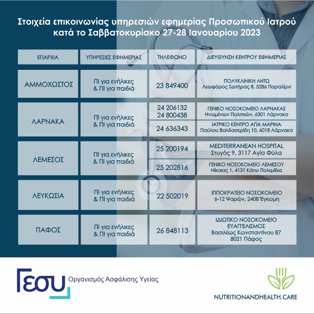 Ο Οργανισμός Ασφάλισης Υγείας (ΟΑΥ) ενημερώνει το κοινό για τα στοιχεία επικοινωνίας των Υπηρεσιών Εφημερίας Προσωπικού Ιατρού (ΠΙ), ανά επαρχία, κατά το Σαββατοκύριακο 27-28 Ιανουαρίου 2024.