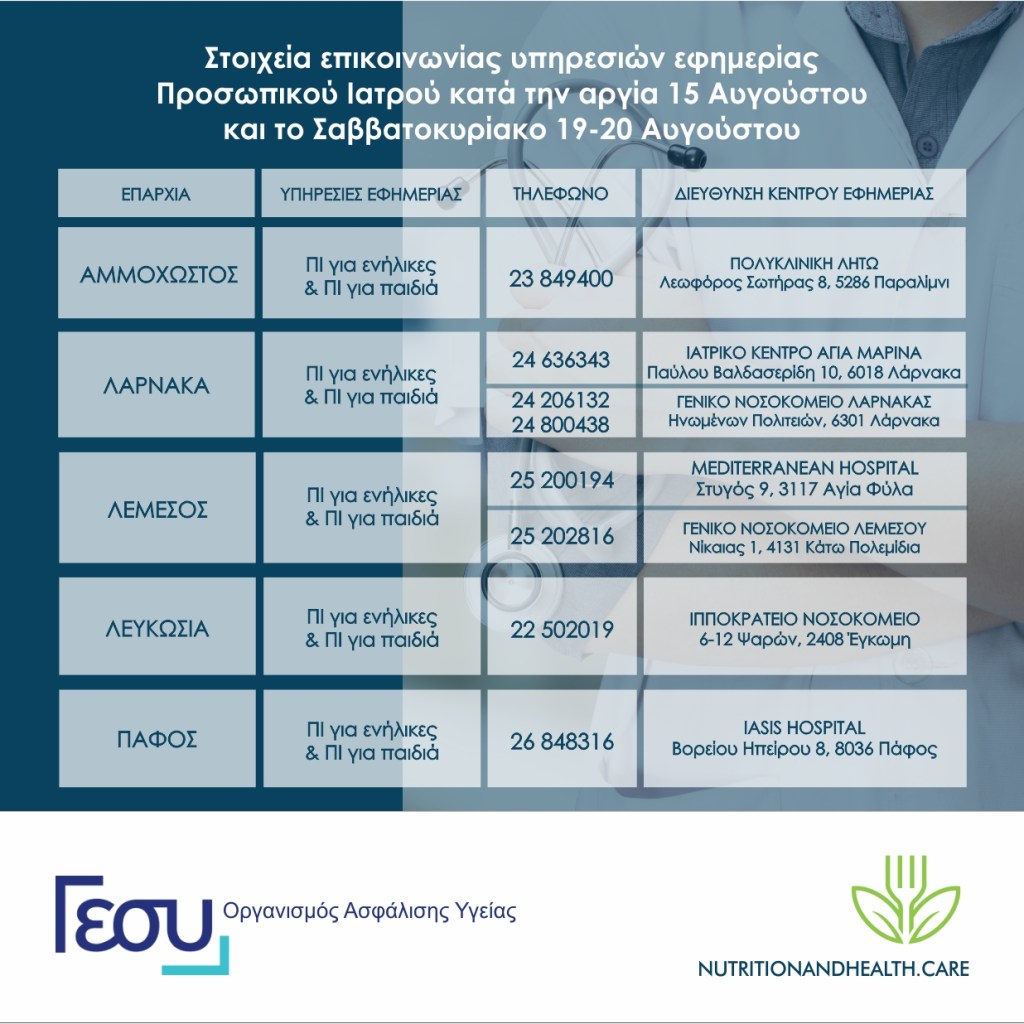 Ο Οργανισμός Ασφάλισης Υγείας (ΟΑΥ) ενημερώνει το κοινό για τα στοιχεία επικοινωνίας των Υπηρεσιών Εφημερίας Προσωπικού Ιατρού (ΠΙ) ανά επαρχία κατά την αργία 15 Αυγούστου και το Σαββατοκύριακο 19-20 Αυγούστου 2023.